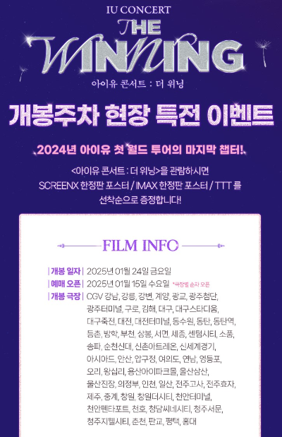 아이유의 콘서트 실황 영화 "아이유 콘서트 : 더 위닝" 이 CGV 에서 올포맷으로 개봉이 확정되었습니다. 2D 뿐 아니라, IMAX, SCREENX, 4DX, ULTRA 4DX까지 콘서트 실황이 영화 최초로 올포맷으로 개봉이 확정되어 전 세계 많은 팬들의 기대를 모으고 있습니다.