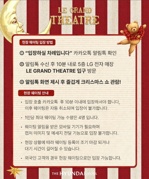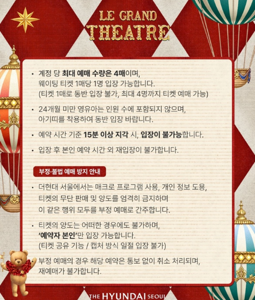 이번 2024년도의 테마는 아기곰 해리와 소녀가 세계 최고의 크리스마스 쇼 "움직이는 대극장" 을 찾아 떠나는 아름다운 여정! 더현대 서울 사운즈 포레스트에 펼쳐진 LE GRAND THEATRE 를 만나보세요!!