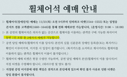 ※휠체어석(장애인석)은 11.21(목) 오전 9:00부터 인터파크 티켓(1544-1555) 또는 임영웅 콘서트 전용 고객센터(1660-1646)를 통해 전화로만 예약 가능합니다.(운영시간 09:00 ~ 18:00)