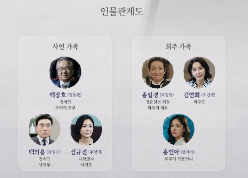 백사언의 가족과 홍희주의 가족부터 그들을 둘러싼 인물들의 인물관계도는 아래와 같습니다.