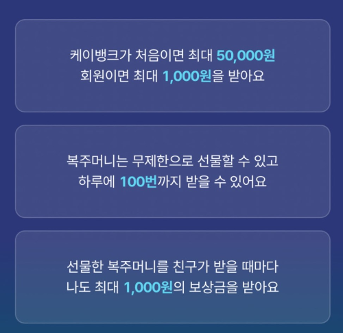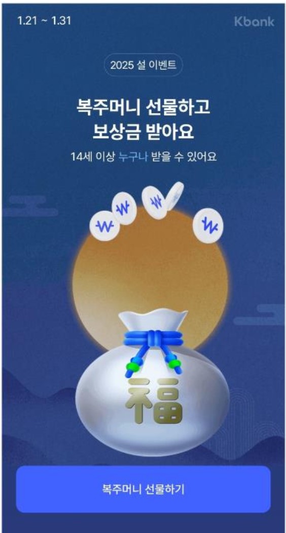 이벤트는 해당 이벤트 기간 동안만 진행되니, 이번 설날 케이뱅크와 함께 풍성한 설날의 혜택을 누려보시기 바랍니다.