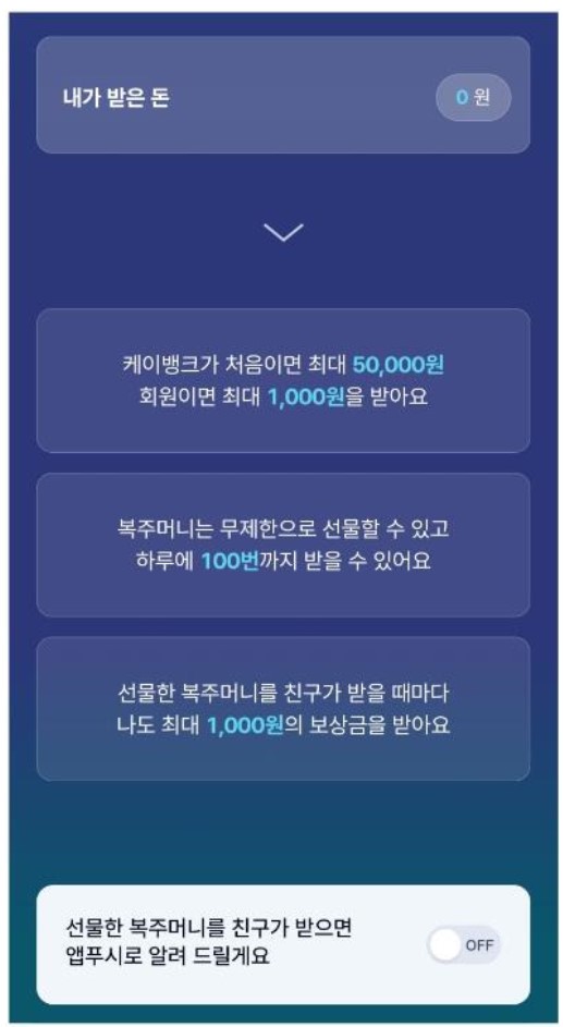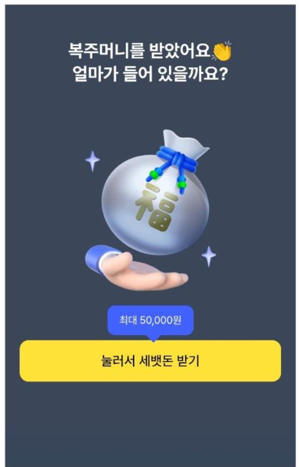 - 기존 고객 혜택 : 기존 고객도 하루 최대 100번까지 복주머니를 열 수 있으며, 최소1원 ~ 최대 1천원까지 받을 수 있습니다.