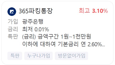 | 광주은행 | 365파킹통장 | 기본 0.01% 연 3.10% |