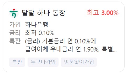 | 하나은행 | 달달하나통장 | 기본 0.10% 연 3.00% |