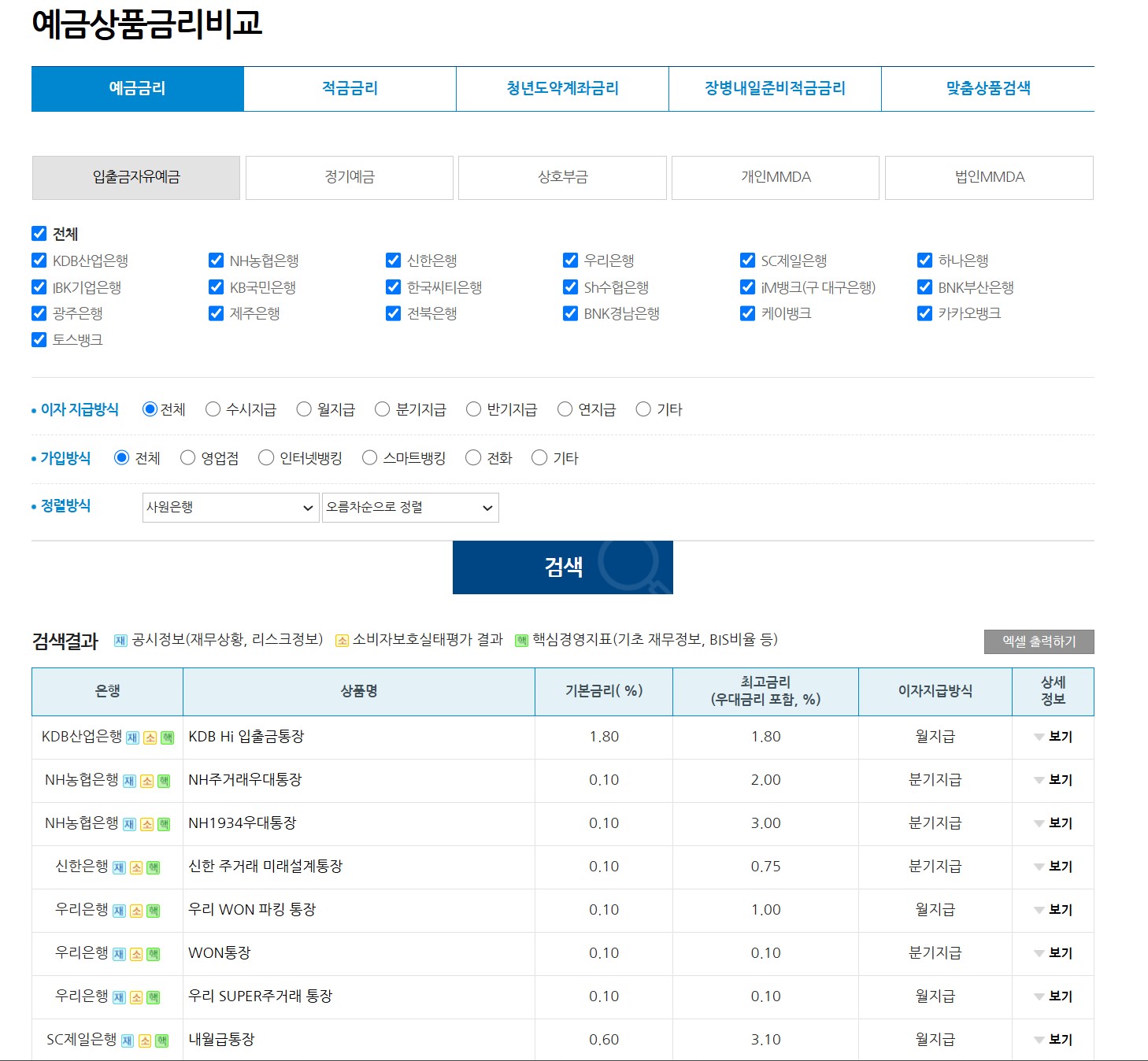 은행연합회 소비자 포털에 가시면 국내 은행의 예금상품금리 비교를 한눈에 찾아보실 수 있습니다. 경제가 어려워도 절망하시기 보다 나의 자산관리에 관심을 갖고 정보를 찾으면 매일매일 소소하게 늘어나는 기쁨도 누리실 수 있습니다.