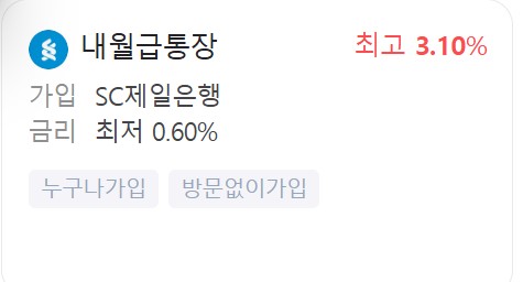 | SC제일은행 | 내월급통장 | 기본 0.60% 연 3.10% |